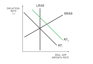 1. Suppose a change in fiscal policy causes the AD curve to shift from AD(1) to AD(2), as shown above. Which response below would most likely cause that shift?