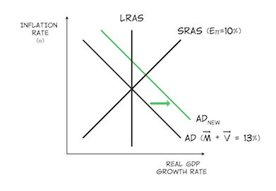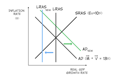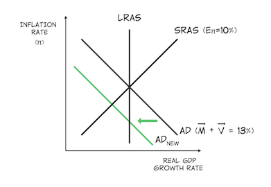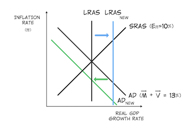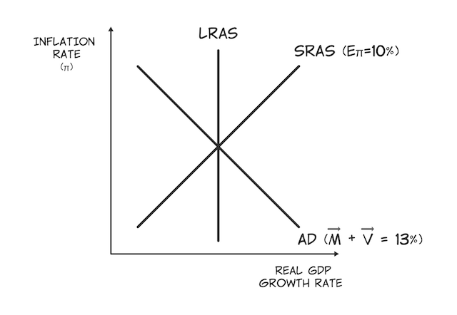 3. Now suppose you’re a central banker in this economy and you want to neutralize this change in the economy. That is, you want to return the economy to its original state by pushing monetary policy in the opposite direction of the shock. If you do your job perfectly and the economy returns to its original state, what will the inflation rate be?