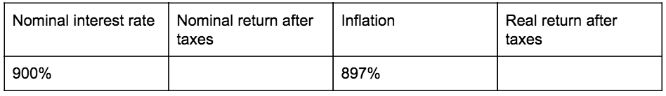 1. What is the nominal rate of return after taxes if the nominal interest rate on a savings account is 900% (!)? Assume the government tax rate is ⅓.